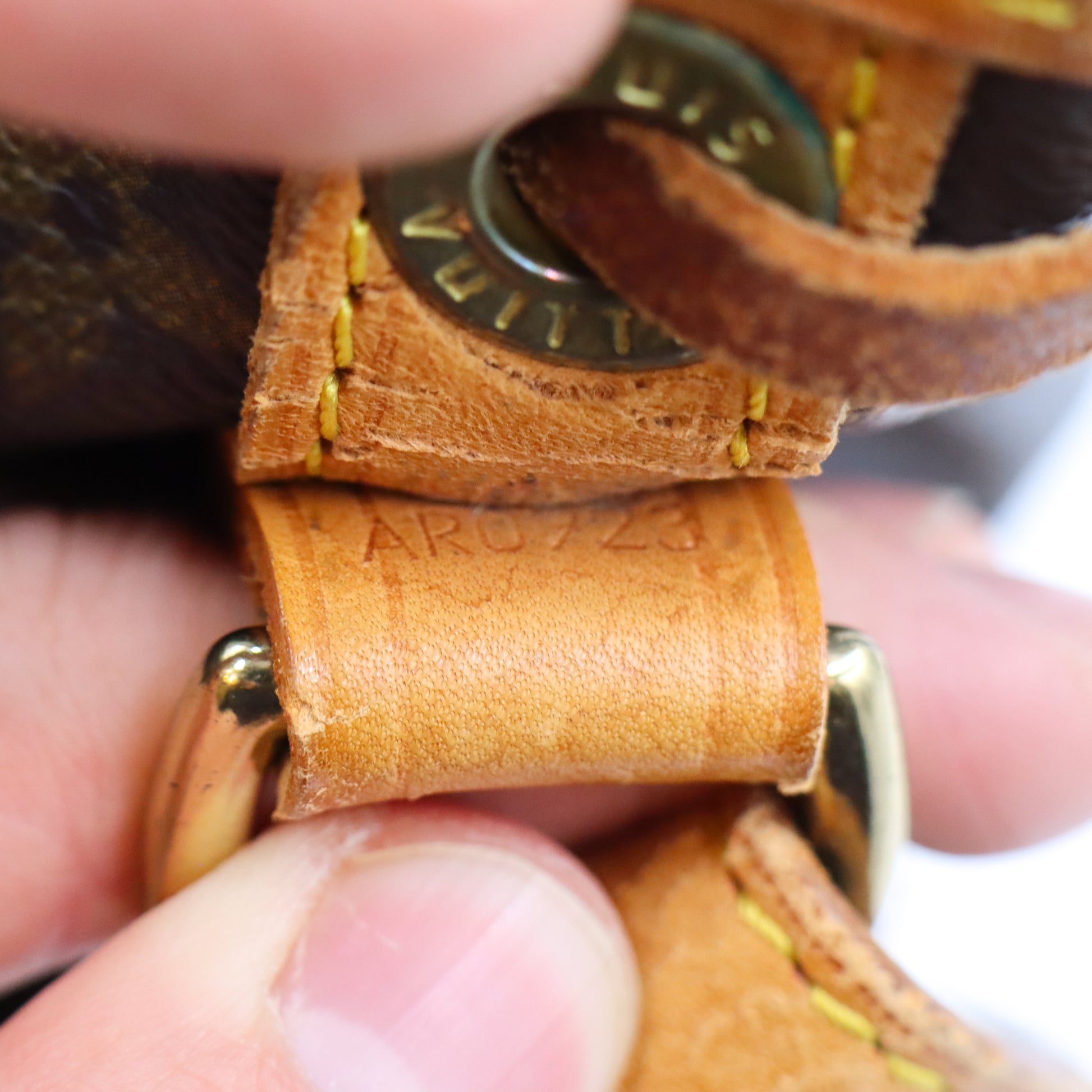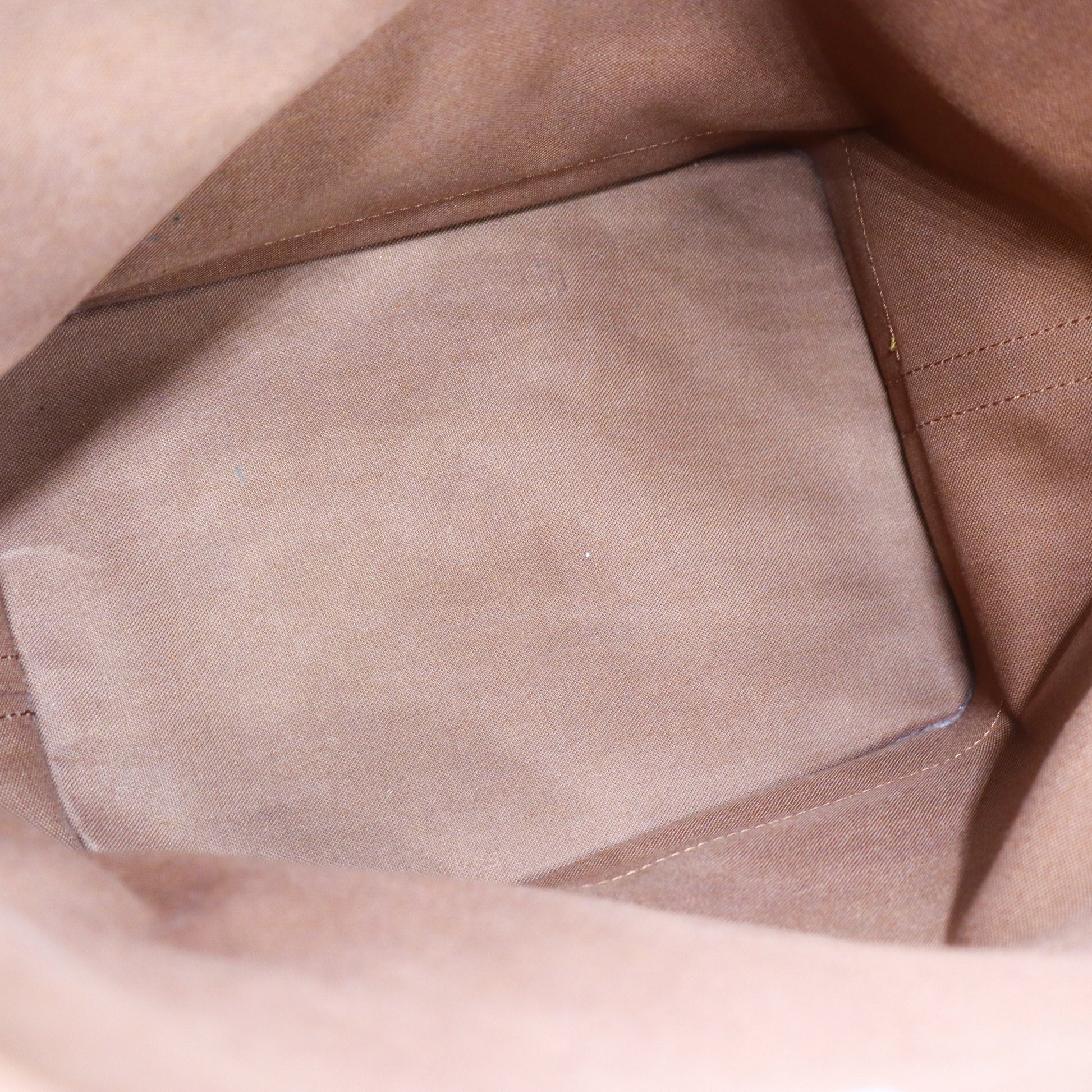 Guter Gebrauchszustand. Leichte Verschmutzung und Verfärbung. Leichte Abnutzung am Leder. Kordelzug kann bei Nutzung reißen. Abrieb an Ecken und Kanten. Risse am Taschenhals.